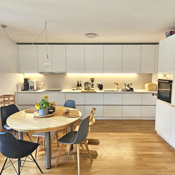 Die Wohnung besteht aus drei Zimmern. Das Wohnzimmer ist mit einer sehr schicken und hochwertigen Einbauküche ausgestattet.