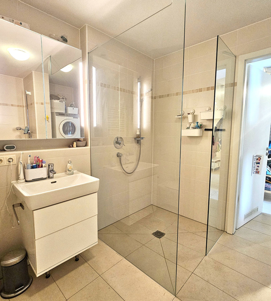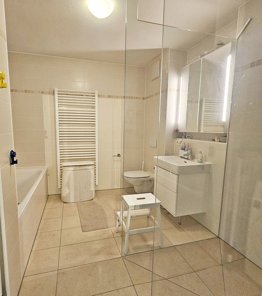 Das Badezimmer ist mit Badewanne, großer bodengleicher Dusche, Waschtisch & WC sowie Stellpatz für Waschmaschine & Trockner, ausgestattet. Zudem gibt es noch ein separates Gäste-WC!