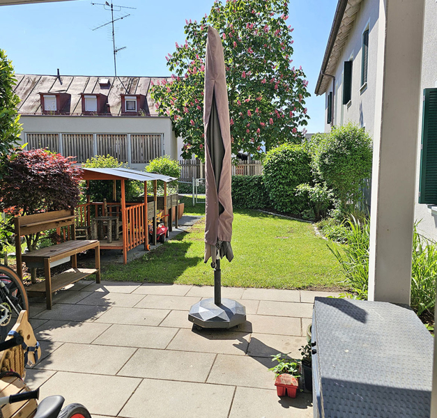 Vom Wohnzimmer aus erreicht man die Terrasse mit kleinem Garten. Der Garten ist eingezäunt und besitzt ein Gartentor, der direkt zu einem eigenen Müllhäuschen für die Gartenabfälle führt.
