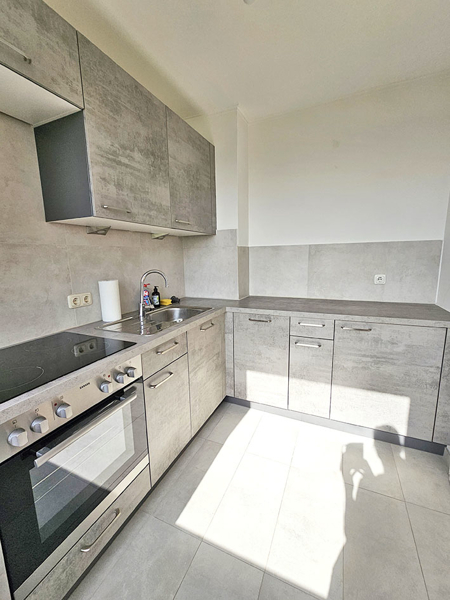 Die Küche beinhaltet Ober.- und Unterschränke, Herd mit Backofen, Geschirrspülmaschine, sowie einen Einbaukühlschrank. Sie ist modern in Grau gehalten und der Boden ist auch Grau gefliest.