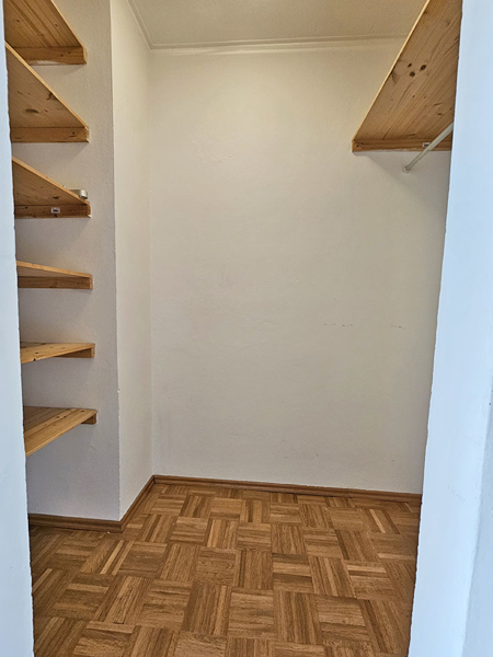 Flur, Abstellraum sowie Wohnen-Schlafen haben einen Mosaik-Parkettboden.