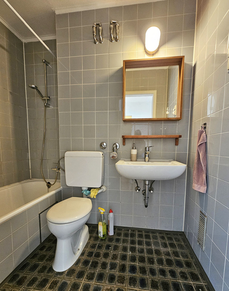 Das Badezimmer beinhaltet Badewanne, Waschtisch, WC und auch einen kleinen Heizkörper.