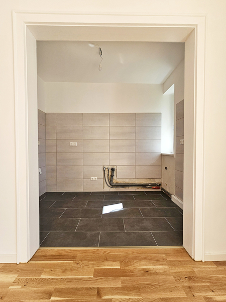 Die angrenzende Kochnische ist ideal um sich eine Küchenzeile, nach eigenem Geschmack, einzubauen.