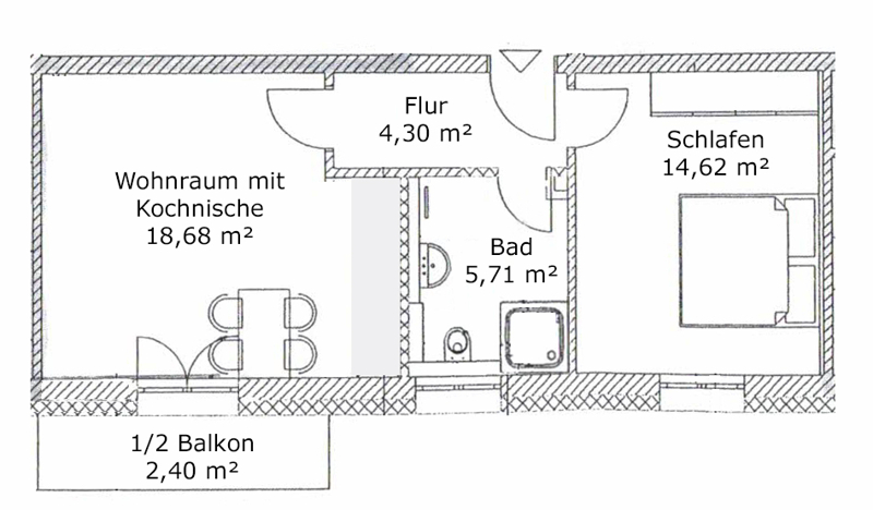 | Wohnfläche | 46 m² | Anzahl Zimmer | 2 |