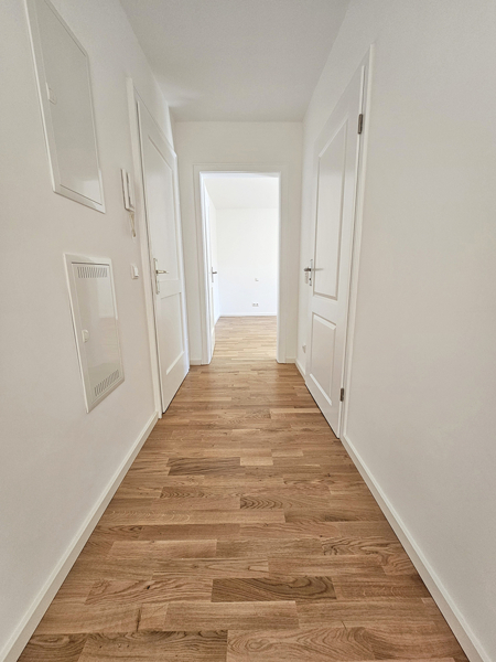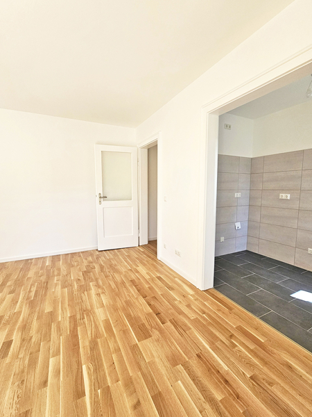 Die Wohnung ist mit einem Parkettboden ausgestattet, außer die Kochnische und das Badezimmer sind gefliest.