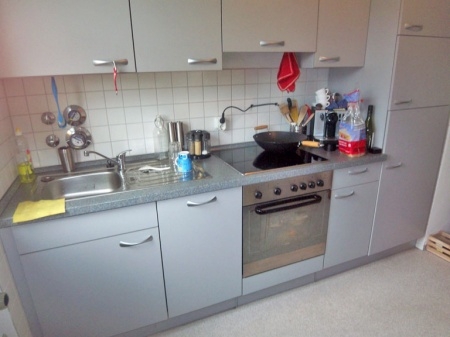 Die Küche sowie der Flur sind mit einem hellgrauen PVC Boden ausgestattet.