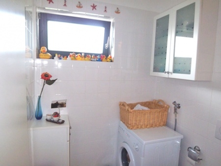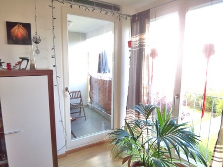 Vom Flur aus gelangt man in das geräumige Wohnzimmer mit Balkon und auch.in das Badezimmer mit Fenster und Platz für die Waschmaschine.