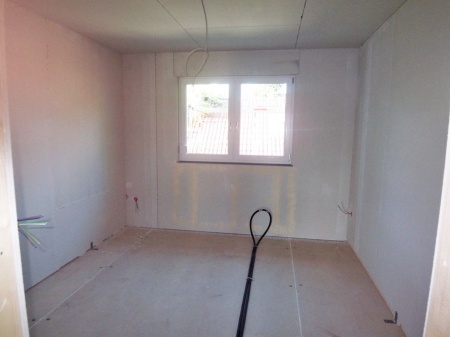 Wohn-Esszimmer sowie die drei Schlafzimmer bekommen einen hellgrauen Laminatboden.Der Flur sowie das Badezimmer werden einheitlich in grau gefliest.
