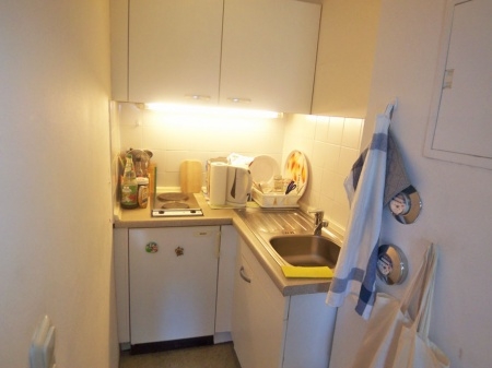 Die Küchenniesche hat einen grauen PVC und ist mit einem Herd mit 2 Kochplatten, einem Kühlschrank und zwei Oberschränken ausgestattet