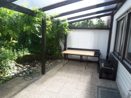 Ein zusätzliches Holzhäuschen, das mit dem Nachbarn zusammen genutzt wird, bietet Stellfläche für die Mülltonnen sowie für Gartengeräte, Fahrräder und sonstigem.