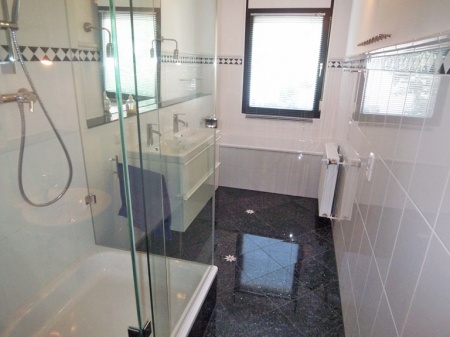 Das Tageslicht erhellte Badezimmer wurde hochwertig mit Granitboden "Blue Pearl" und weißer Hochglanzfliese ausgestattet. Es beinhaltet eine Glasdusche, Badewanne, Doppelwaschbecken sowie eine Toilette mit Handwaschbecken.