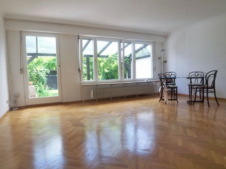 Der Essbereich ist mit Marmorboden (beige) ausgestattet und im Wohnzimmerbereich befindet sich Massivholzparkett. Vom Wohnzimmer erreicht man den sehr hübsch eingewachsenen Garten mit überdachter Terrasse. Im Garten gibt es einen kleinen Teich und an der Terrasse eine Einrichtung für einen Sprudelstein.