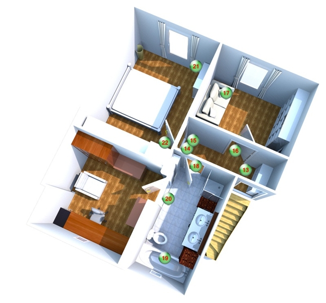 Dort befinden sich ein Schlafzimmer, Gästezimmer, Büro sowie ein Badezimmer mit Dusche und Badewanne.